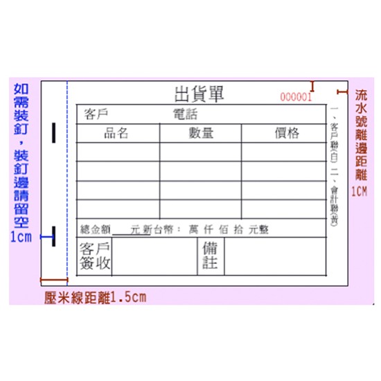 - 聯單顏色:單色(白、紅、藍、綠、黃擇一)